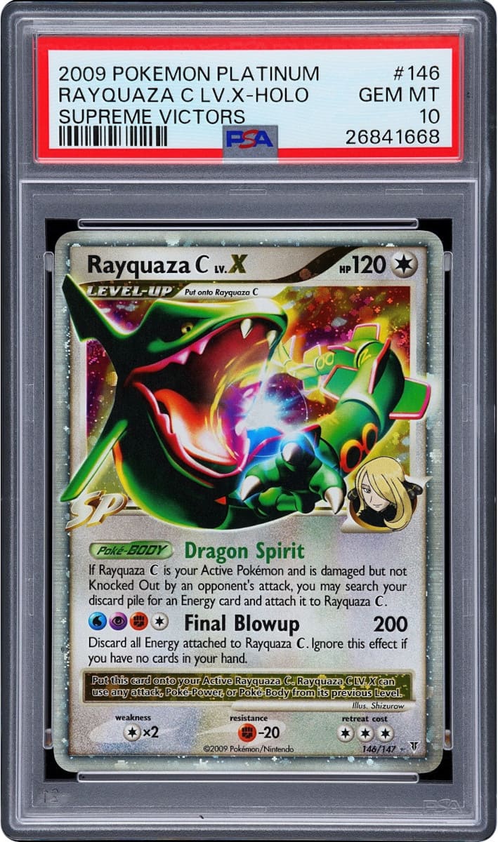 Diese Karten sind durch kurze Ergänzungen neben ihrem Namen leicht zu erkennen, wie z. B. „G“, „GL“, „4“, „C“ oder „FB“. Jede Abkürzung steht dabei für die Zugehörigkeit zu einem Team oder einer Trainergruppe. Das hier gezeigte Rayquaza C aus der Erweiterung Ultimative Sieger gehört zum Team der Champ-Trainerin Cynthia. Englische PSA-10-Karten erzielen Preise von bis zu 30.000 US-Dollar (ca. 26.000 €).