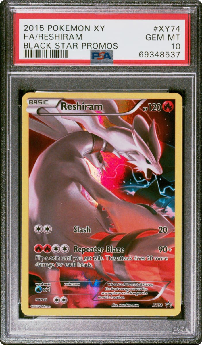 Diese Reshiram-Promokarte aus der XY-Serie war exklusiv in der Pikachu-EX Legendary Collection erhältlich. Sie lässt sich mit Schwarzes Kyurem verbinden, um eine zusammenhängende Illustration zu bilden. Einwandfreie Exemplare sind besonders selten: Obwohl PSA insgesamt 784 Karten bewertet hat, wurden nur 8 mit der höchstmöglichen Bewertung „PSA 10“ ausgezeichnet. Am 1. April 2026 verkaufte sich eine dieser Karten für 15.500 US-Dollar (ca. 13.400 €).