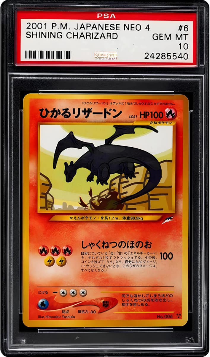 Das Schimmernde Glurak aus der Erweiterung Neo Destiny zählt zu den begehrtesten Pokémon-Karten aller Zeiten. Im Gegensatz zur internationalen Ausgabe verfügt die japanische Karte über strahlend goldene Kartenränder. Weltweit existieren lediglich 68 japanische PSA-10-Karten. Am 29. März 2026 erzielte das Schimmernde Glurak einen neuen Rekordpreis von 90.100 US-Dollar (ca. 78.100 €).