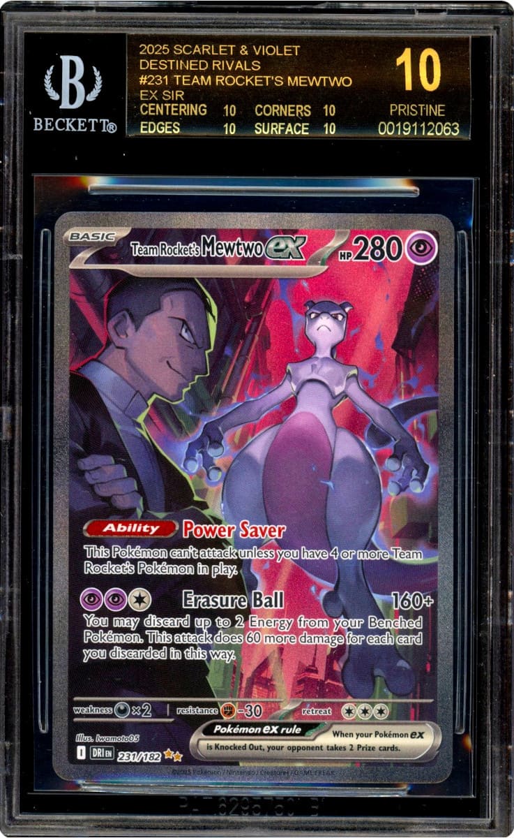 In der gefeierten Erweiterung Karmesin & Purpur – Ewige Rivalen kehrt das schurkische Team Rocket zurück und hat zahlreiche gestohlene Trainer-Pokémon um sich versammelt, die mit rücksichtslosen Angriffen Furcht und Schrecken verbreiten. Die finstere Illustrationskarte von Team Rockets Mewtu-ex gilt als das wertvollste Sammlerstück dieses Sets. Eine von nur 21 makellosen Black-Label-Karten erzielte nun einen neuen Rekordpreis von 14.290 US-Dollar (ca. 12.400 €).