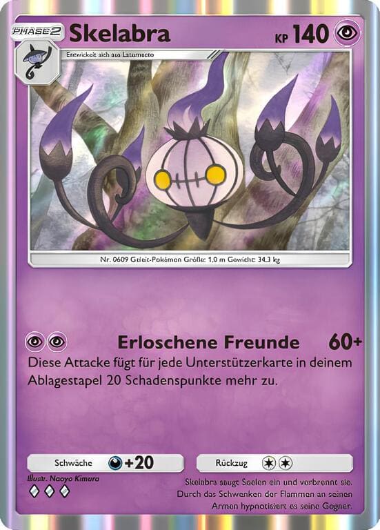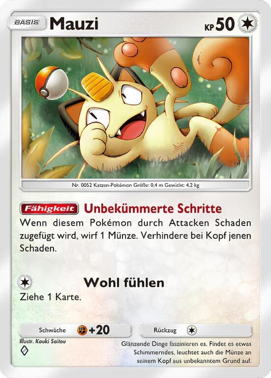 Das Psycho-Pokémon Skelabra besitzt 140 KP und verursacht mit seiner Attacke „Erloschene Freunde“ 60 Schadenspunkte für zwei Psycho-Energien. Mit jeder Unterstützerkarte in deinem Ablagestapel wird die Attacke um 20 Schadenspunkte stärker. Bei nur fünf Unterstützerkarten teilt Skelabra also beeindruckende 160 Schadenspunkte aus. Mithilfe von Rot lässt sich der Schaden noch weiter erhöhen. Da es sich um ein Phase-2-Pokémon handelt und du zahlreiche Unterstützerkarten in den Ablagestapel befördern musst, benötigt Skelabra einen verlässlichen Partner für die ersten Runden. Hier kommt das Basis-Pokémon Mauzi ins Spiel.