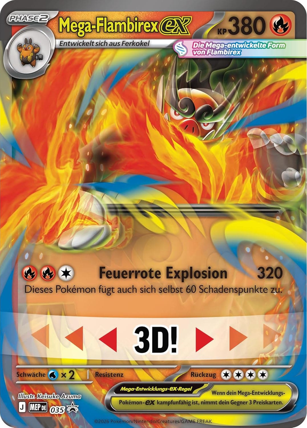 Mega-Flambirex-ex legt einen brandheißen Auftritt hin und betritt die Bühne mit kraftvollen 380 KP. Damit zählt es zu den stärksten Mega-Pokémon-ex, die bislang im Sammelkartenspiel erschienen sind. Mit seiner „Feuerroten Explosion“ fügt das Feuerschwein-Pokémon außerdem 320 Schadenspunkte für drei Energien zu, jedoch musst du mit einem Rückstoßschaden von 60 Punkten rechnen.