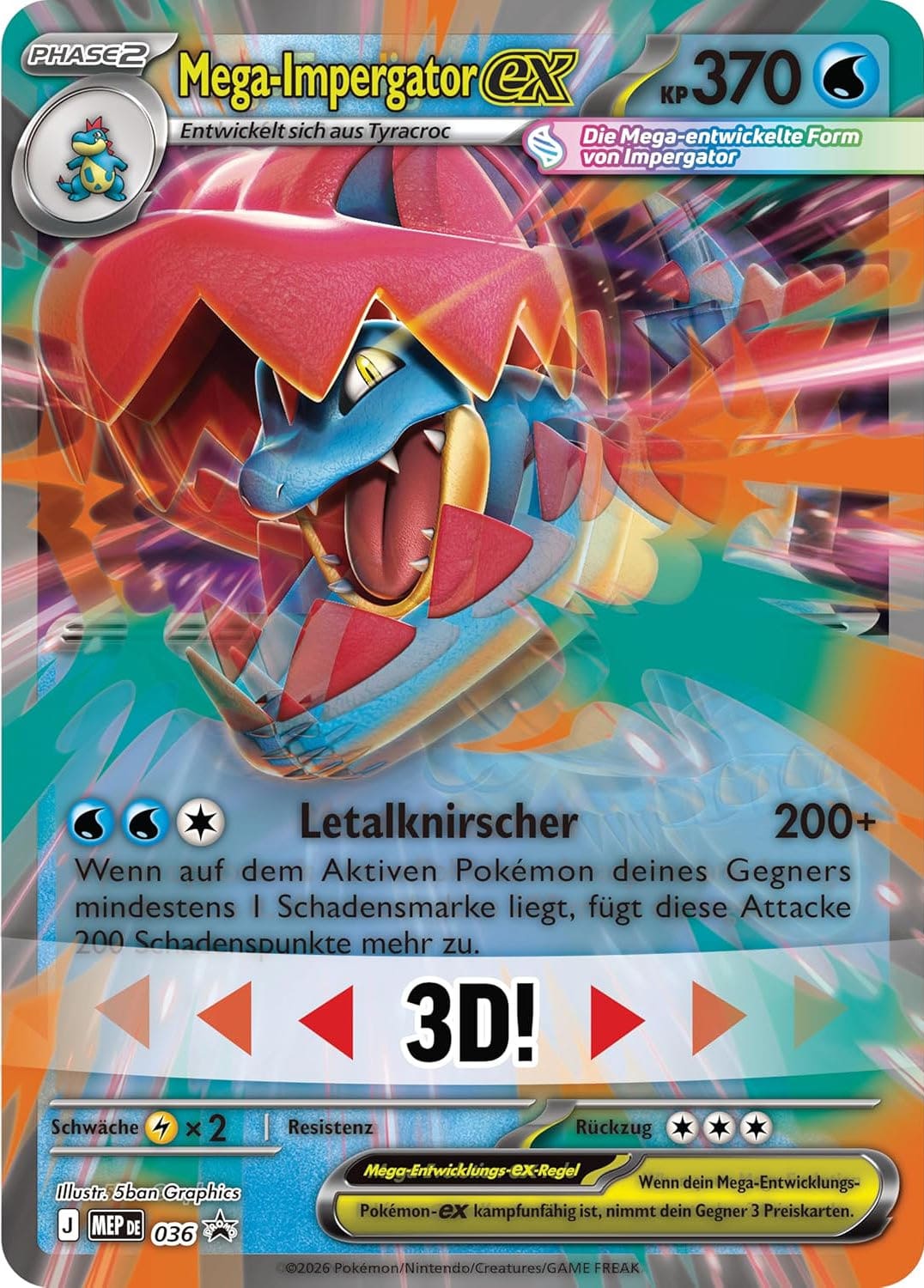 Neben vier Boosterpacks des Spezialsets erwartet dich auch eine exklusive Promokarte Mega-Meganie-ex, Mega-Flambirex-ex oder Mega-Impergator-ex. Zusätzlich erhältst du eine überdimensionale 3D-Karte im Lentikular-Stil. Beim Hin- und Herbewegen wechselt die Illustration und erweckt den Eindruck, als würde das Pokémon angreifen.