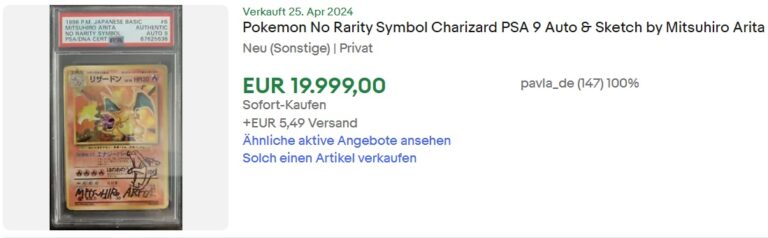 Die deutschen Glurak-Karten aus der limitierten ersten Veröffentlichung des Basis-Sets erfreuen sich ebenfalls einer hohen Nachfrage unter Sammlern. Zwei Exemplare, die von PSA und Beckett bewertet wurden, erzielten kürzlich Verkaufspreise von etwa 2.200€ bzw. 2.800€.