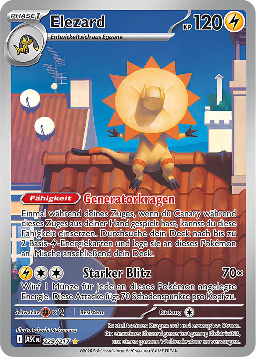 Auf dieser sommerlichen Illustrationskarte kannst du Elezard beim Sonnenanbeten beobachten. Das Generatoren-Pokémon nutzt seinen imposanten Kragen, um Sonnenstrahlen zu absorbieren und in elektrische Energie umzuwandeln. Seine Fähigkeit „Generatorenkragen“ ermöglicht es dir, Elezard mit bis zu zwei Elektro-Energien aus deinem Deck aufzuladen. Du kannst sie jedoch erst aktivieren, wenn du zuvor die Unterstützerkarte Canary aus deiner Hand gespielt hast.