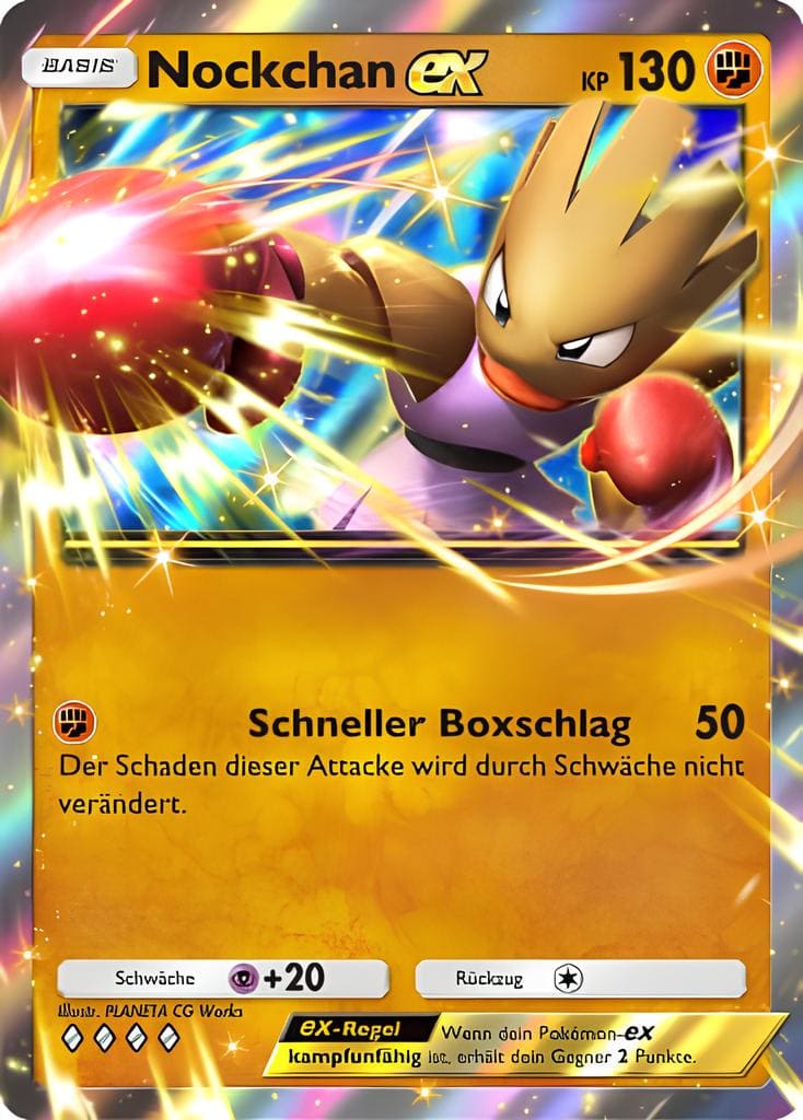 Dieses Deck setzt Nockchan-ex aus der neuesten Erweiterung Mega-Aufstieg als schnell einsatzbereiten Angreifer für das frühe Spiel ein. Sein „Schneller Boxschlag“ verursacht 50 Schadenspunkte für nur eine Energie und kann schwache Gegner leicht überwältigen oder starke Gegner schwächen. Dank seiner niedrigen Rückzugskosten lässt sich das Basis-Pokémon zudem problemlos austauschen.