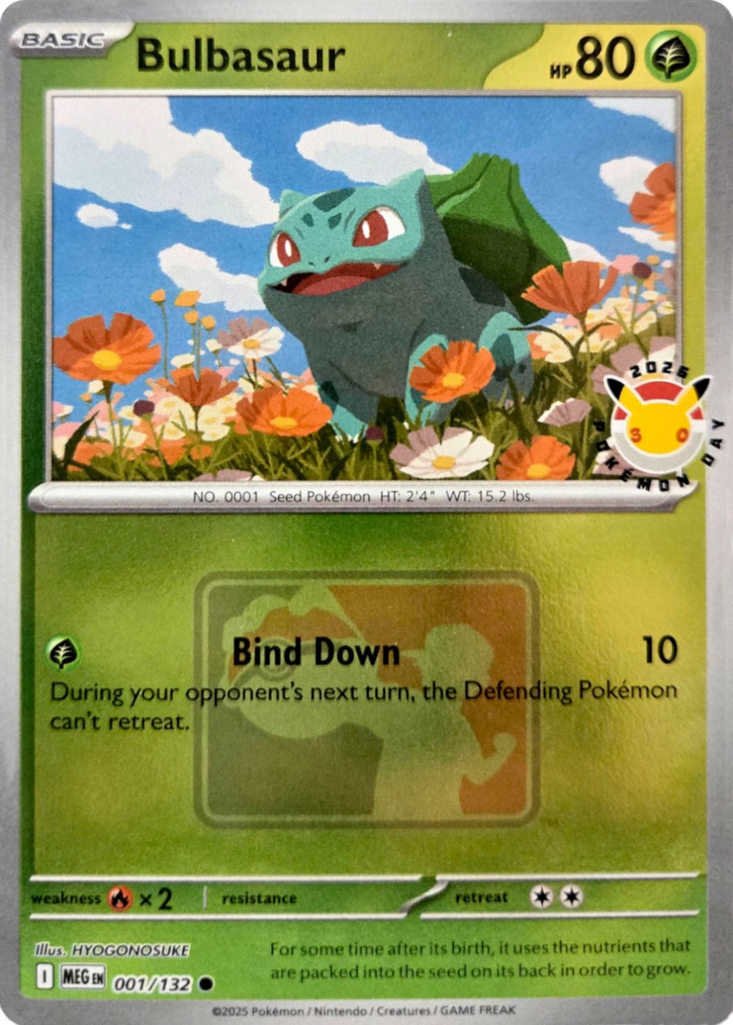 Bisasam ist ein Nachdruck aus der Erweiterung Mega-Entwicklung und verfügt über einen exklusiven „Pokémon Day 2026“-Stempel sowie ein holografisches Pokémon-Liga-Logo hinter dem Textfeld. Die Promokarte ist nur erhältlich, solange der Vorrat reicht. Derzeit liegt uns lediglich ein Bild der englischen Variante vor.