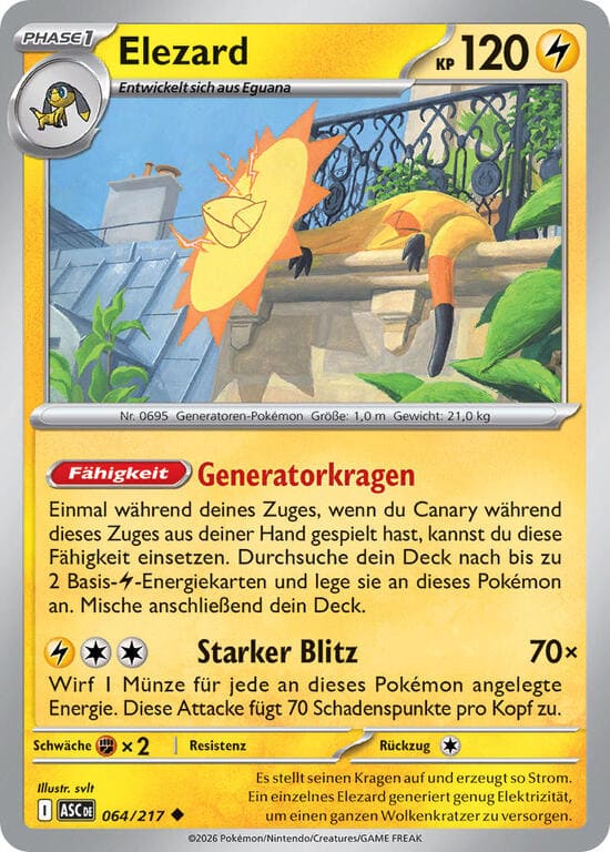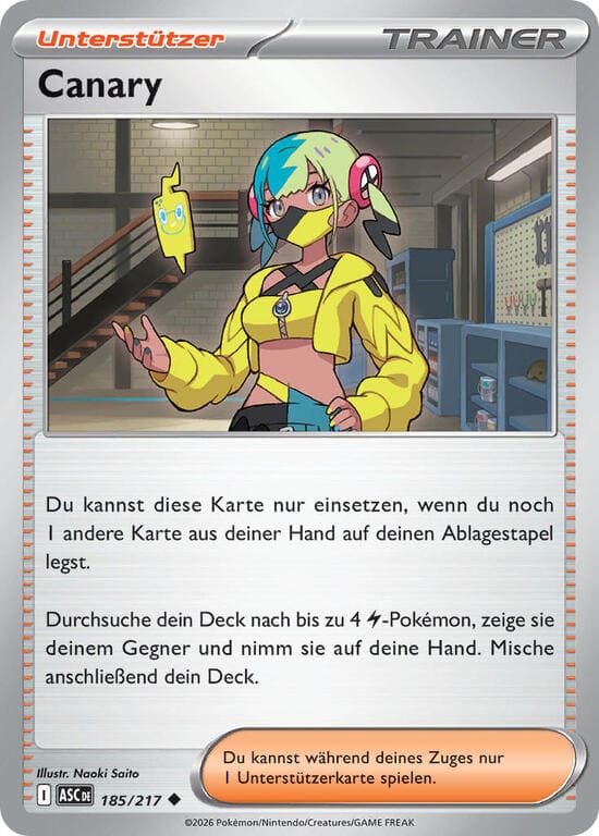 Einmal während deines Zuges, wenn du Canary während dieses Zuges aus deiner Hand gespielt hast, kannst du diese Fähigkeit einsetzen. Durchsuche dein Deck nach bis zu 2 Basis-Elektro-Energiekarten und lege sie an dieses Pokémon an. Mische anschließend dein Deck.