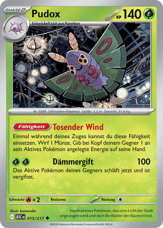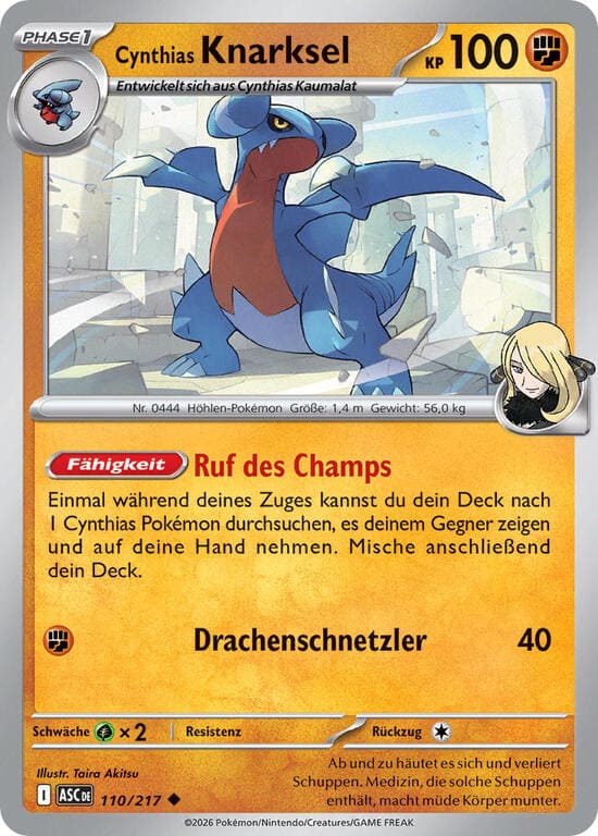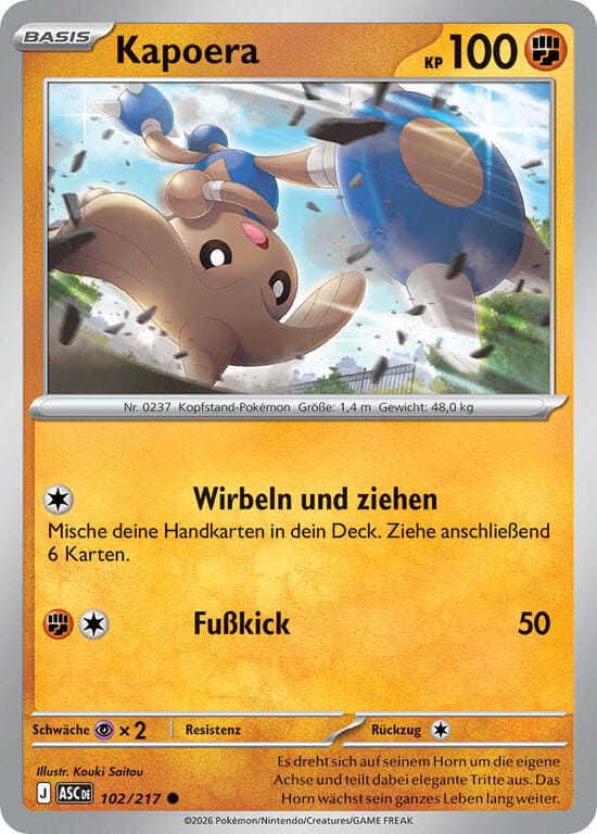 Einmal während deines Zugen, wenn an dieses Pokémon mindestens 1 Energie angelegt ist, kannst du diese Fähigkeit einsetzen. Durchsuche dein Deck nach 1 Entwicklungs-Pokémon, zeige es deinem Gegner und nimm es auf deine Hand. Mische Anschließend dein Deck.