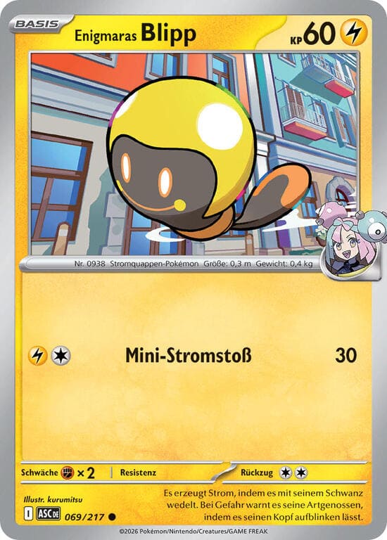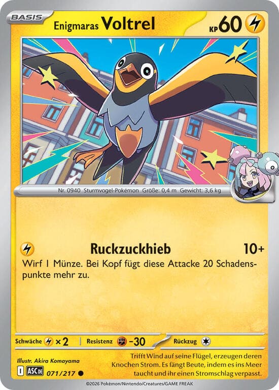 Beliebig oft während deines Zuges kannst du 1 Basis-Elektro-Energiekarte aus deiner Hand an 1 deiner Enigmaras Pokémon anlegen.