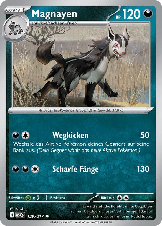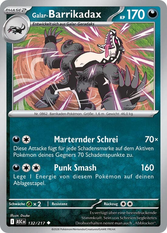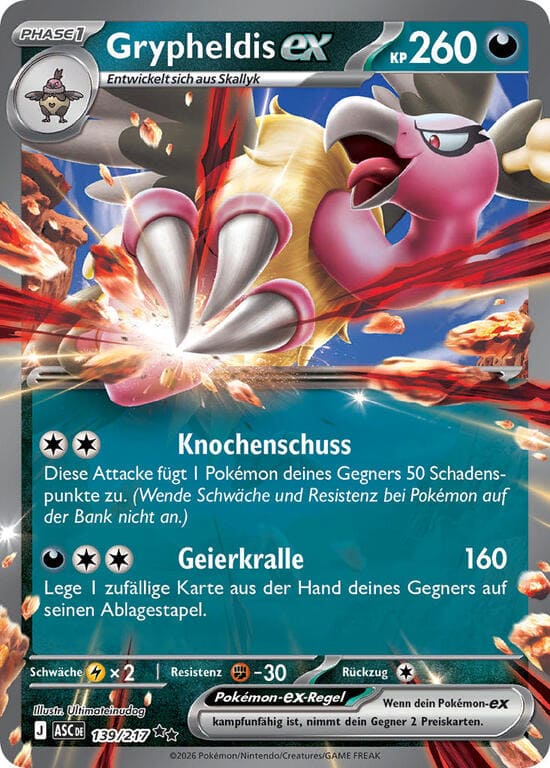 Fieser Einschlag – 120+ Schadenspunkte. Wenn du eine Unterstützerkarte, bei der „Team Rocket“ zum Namen gehört, während dieses Zuges aus deiner Hand gespielt hast, fügt diese Attacke 100 Schadenspunkte mehr zu.