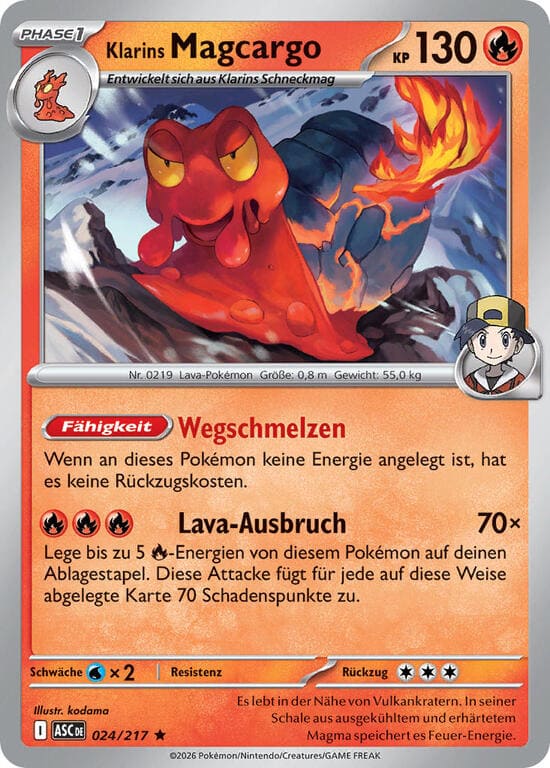 Lava-Ausbruch – 70x Schadenspunkte. Lege bis zu 5 Feuer-Energien von diesem Pokémon auf deinen Ablagestapel. Diese Attacke fügt für jede auf diese Weise abgelegte Karte 70 Schadenspunkte zu.