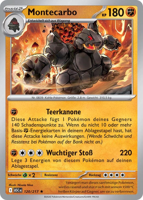 Teerkanone – Diese Attacke fügt 1 Pokémon deines Gegners 140 Schadenspunkte zu. Wenn du nicht 10 oder mehr Basis-Kampf-Energiekarten in deinem Ablagestapel hast, hat diese Attacke keine Auswirkungen. (Wende Schwäche und Resistenz bei Pokémon auf der Bank nicht an.)