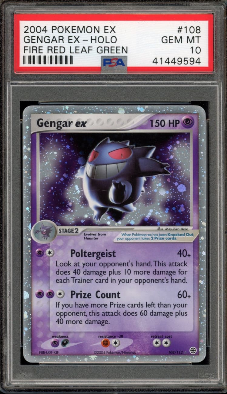 Die erste jemals veröffentlichte ex-Karte von Gengar erschien im August 2004 in der Erweiterung EX Feuerrot & Blattgrün. Basierend auf den gleichnamigen Videospielen für den Game Boy Advance enthält das Set ausschließlich Pokémon der ersten Generation. Gengar-ex zeichnet sich durch funkelnde holografische Effekte aus, die sich bis in die Kartenränder erstrecken. Sammler investieren derzeit bis zu 13.755 US-Dollar (ca. 11.600 €) in PSA-10-Exemplare.