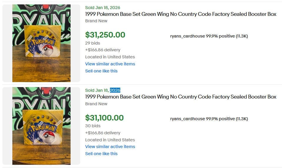 Darüber hinaus erzielten zwei unlimitierte Booster-Displays aus dem englischen Base Set jeweils Preise von etwa 31.000 US-Dollar (ca. 26,400 €).