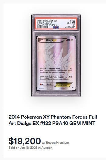 Die einzige jemals veröffentlichte silberne Full-Art-Karte erschien im November 2014 in der Erweiterung Phantomkräfte. Dialga-EX zeichnet sich durch eine glänzende Oberfläche und besondere Texturen aus. Weltweit existieren nur 55 makellose PSA-10-Karten. Der aktuelle Handelswert beträgt etwa 19.200 US-Dollar (ca. 16.350 €). Zuletzt wurde eine PSA-10-Karte im Oktober 2025 für 14.900 US-Dollar versteigert.