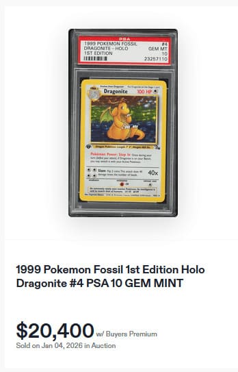 Eine seltene PSA-10-Karte des holografischen Dragoran aus Fossil kam am 4. Januar 2026 für 20.400 US-Dollar (ca. 17.400 €) unter den Hammer. Das entspricht einer Preissteigerung von etwa 6.000 US-Dollar im Vergleich zu November 2025.