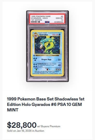 Das feuerrote Garados-Goldstar aus der Erweiterung EX Holon Phantoms ist ein wahrer Schatz für Sammler. Bis heute haben nur 37 Exemplare die höchstmögliche PSA-10-Bewertung erreicht. Im vergangenen Jahr wurde eine dieser Karten für 60.000 US-Dollar (ca. 51.500 €) versteigert. Dieser Preis konnte am 7. Januar 2026 noch einmal deutlich gesteigert werden. Bei eBay wechselte eine PSA-10-Karte für beeindruckende 98.888 US-Dollar (ca. 84.500 €) den Besitzer.