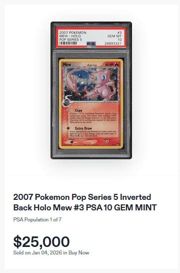Mew stammt aus der POP-Serie 5, einer speziellen Erweiterung, die ausschließlich im Jahr 2007 in limitierten Promo-Boosterpacks an Teilnehmer von Pokémon Organized Play-Turnieren verteilt wurde. Dieses spezielle Exemplar zeichnet sich durch den sogenannten „Inverted Back“-Error aus. Im Gegensatz zu normalen Pokémon-Karten wurde die Rückseite falschherum aufgedruckt. Derzeit existieren weltweit nur sieben einwandfreie PSA-10-Exemplare. Der aktuelle Marktwert liegt bei 25.000 US-Dollar (ca. 21.500 €).