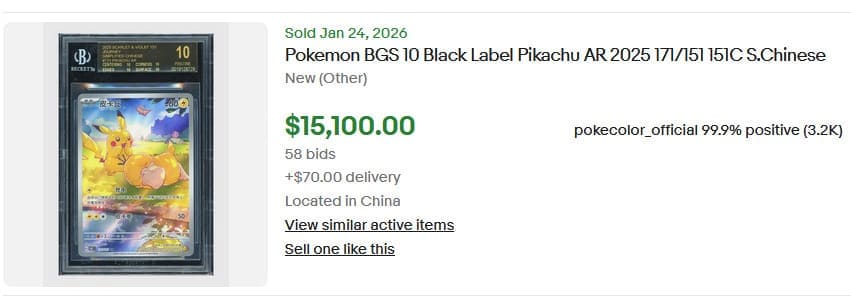 Vorsicht, Enton! Während das kleine Enten-Pokémon ein entspanntes Mittagsschläfchen genießt, schleicht sich das freche Pikachu von hinten an, um es zu erschrecken. Seine farbenfrohe Illustrationskarte ist exklusiv in der zweiten Erweiterung der chinesischen Serie Collect 151 erhältlich. Ein makelloses Black-Label-Exemplar erzielte am 24. Januar einen Preis von 15.100 US-Dollar (ca. 12.700 €). Im Oktober 2025 lag der Handelswert noch bei 21.100 US-Dollar (ca. 17.800 €).