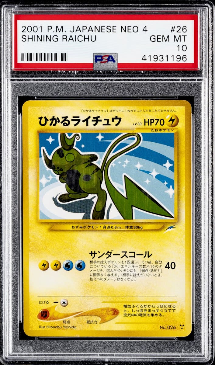 Das Schimmernde Raichu aus der Erweiterung Neo Destiny sticht durch goldglänzende holografische Effekte hervor. Die japanische Variante erzielt im einwandfreien Zustand Preise von bis zu 13.999 US-Dollar (ca. 11.800 €).