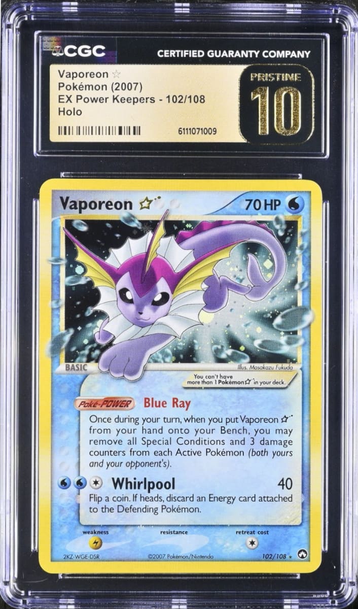 Dieser originalgetreue Nachdruck von Evoli aus dem Dschungel-Set verfügt über einen besonderen Holofoil-Effekt, der einem leuchtenden Feuerwerk ähnelt. Er wurde exklusiv in der Legendary Collection verwendet. Insgesamt wurden nur 27 Reverse-Holo-Karten von Evoli mit der höchstmöglichen PSA-10-Bewertung ausgezeichnet. Eine dieser Karten wechselte kürzlich für 10.000 US-Dollar (ca. 8.500 €) den Besitzer.
