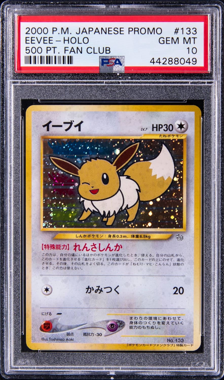 Das blinzelnde Evoli wurde von April 2000 bis Dezember 2002 exklusiv an die Mitglieder des japanischen Pokémon Card Fan Clubs verteilt, die 500 Spielpunkte bei offiziellen Turnieren erreicht hatten. Zum Zeitpunkt dieses Artikels existieren weltweit nur 82 einwandfreie PSA-10-Exemplare. Eine dieser Karten erzielte am 1. März einen neuen Höchstpreis von 43.200 US-Dollar (ca. 37.100 €).