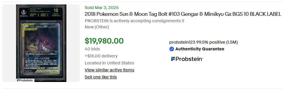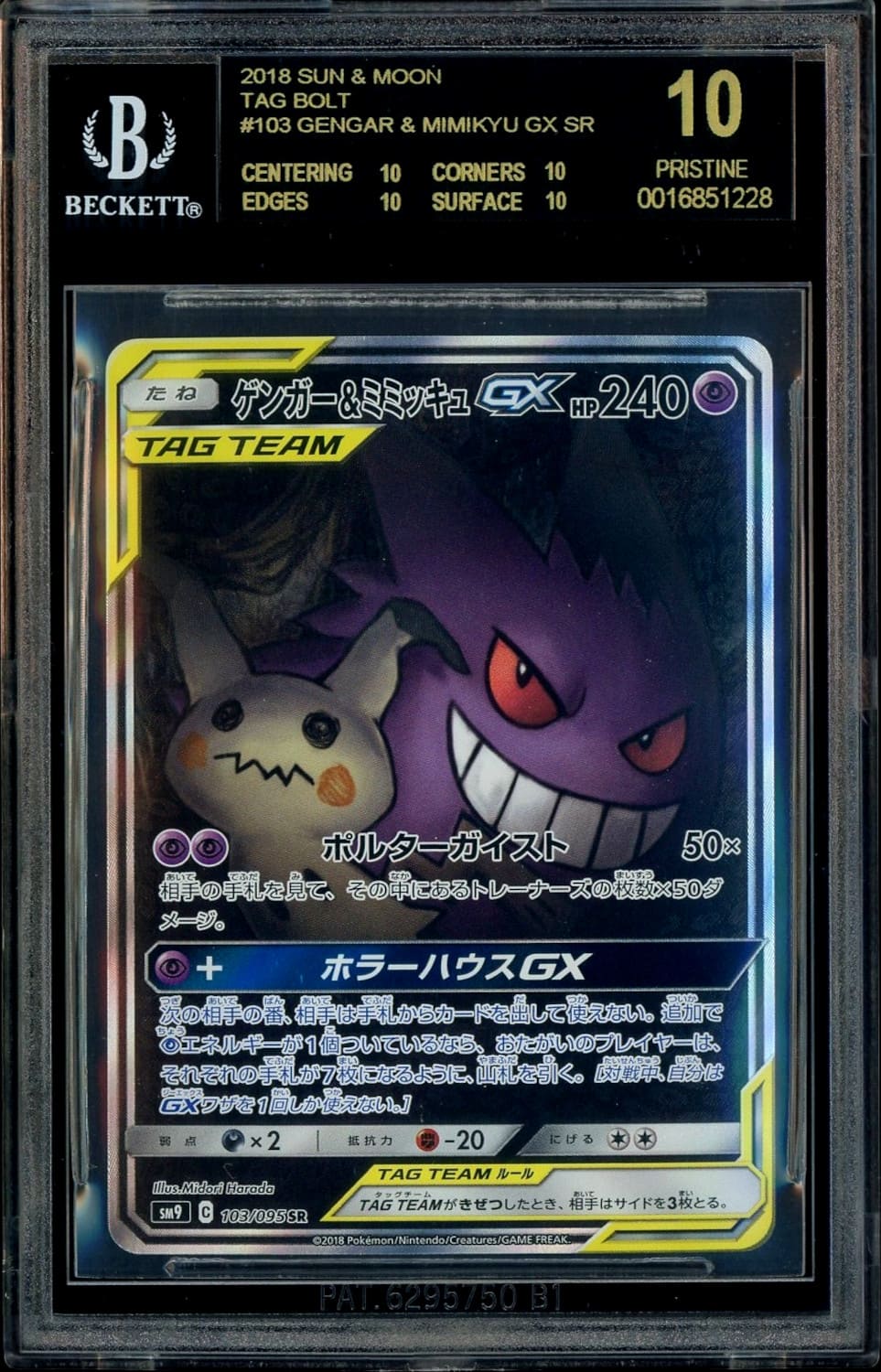 Neben den normalen Varianten gibt es auch besonders seltene Alternate-Art-Exemplare, die mit kunstvollen Illustrationen und texturierten Oberflächen beeindrucken. Auf dieser alternativen Karte aus der japanischen Erweiterung Tag Bolt (Teams sind Trumpf) ist Gengar gemeinsam mit dem kleinen Kostümspuk-Pokémon Mimigma abgebildet. Der aktuelle Handelswert für makellose Black-Label-Karten beträgt bis zu 20.000 US-Dollar (ca. 17.200 €).