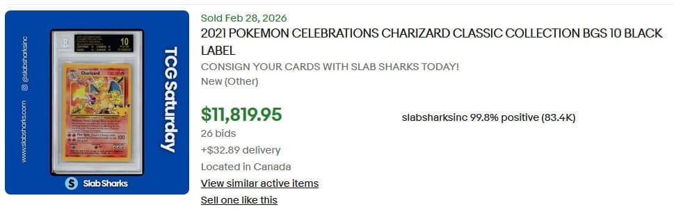 Neben Nachtara-Goldstar, Schimmerndes Karpador und Pikachu können Sammler in Celebrations auch einen originalgetreuen Nachdruck von Glurak aus dem legendären Basis-Set entdecken. Während unbewertete Exemplare bereits für weniger als 200 € erhältlich sind, wurde eine von nur 14 makellosen Black-Label-Karten kürzlich für beeindruckende 11.800 US-Dollar (ca. 10.100 €) versteigert.
