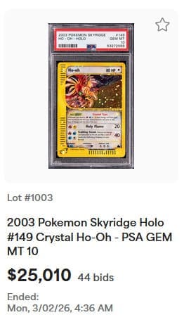 Der majestätische Feuervogel Ho-Oh erscheint in der Erweiterung Skyridge auf einer funkelnden Kristall-Pokémon-Karte. Ein Sammler investierte am 2. März 2026 beeindruckende 25.000 US-Dollar (ca. 21.500 €) in ein englisches PSA-10-Exemplar.