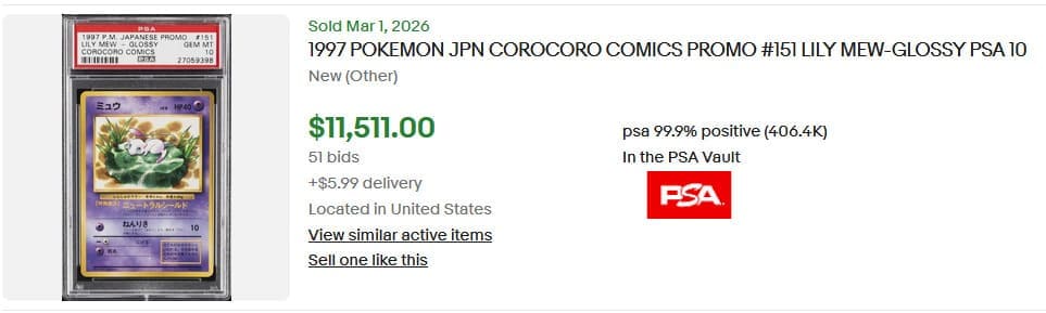 Diese seltene Mew-Promokarte war als Beilage in der Februar-1997-Ausgabe des japanischen Manga-Magazins „CoroCoro Comics“ erhältlich. International wurde sie erstmals im Jahr 2002 als Wizards Black Star Promo veröffentlicht. Zur Feier des 20. Pokémon-Jubiläums erschien außerdem ein Nachdruck im Jubiläumsset XY – Evolution. Im Gegensatz zu den Nachdrucken zeichnet sich das japanische Original durch eine glänzende Oberfläche aus. Der aktuelle Marktwert für PSA-10-Exemplare liegt bei bis zu 11.500 US-Dollar (ca. 9.900 €).
