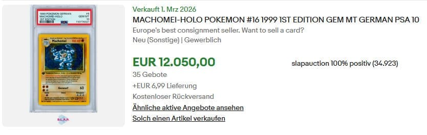 Im Gegensatz zu den 15 anderen holografischen Karten war Machomei ausschließlich im Starterset für zwei Spieler erhältlich, das gemeinsam mit dem Basis-Set erschien. Aus diesem Grund existiert keine unlimitierte Variante. Alle holografischen Machomei-Karten tragen den begehrten 1st-Edition-Stempel. Obwohl PSA insgesamt mehr als 1.450 deutsche Exemplare bewertet hat, wurden nur 13 als makellos eingestuft. Am 1. März 2026 wurde eine PSA-10-Karte für 12.050 € versteigert.