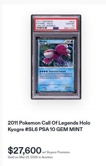 Gut erhaltene holografische Karten aus Ruf der Legenden sind äußerst selten: Insgesamt wurden nur 24 Karten von Schillerndes Kyogre mit der höchstmöglichen Bewertung „PSA 10“ ausgezeichnet. Zuletzt wechselte eine dieser Karten für 27.600 US-Dollar (ca. 23.700 €) den Besitzer.