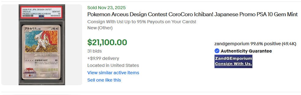 Das japanische Comic-Magazin CoroCoro Ichiban! veranstaltete im Jahr 2009 zur Feier der Veröffentlichung des Kinofilms „Arceus und der Juwel des Lebens“ einen besonderen Design-Contest. Fans wurden eingeladen, ihre besten Zeichnungen von Arceus an das Magazin zu senden. Die Gewinner-Illustrationen wurden im Juli 2009 als Promokarten veröffentlicht, wobei jeder Gesamtsieger jeweils ein vollständiges Set erhielt. Eine dieser Gewinnerkarten wechselte am 23. November für beachtliche 21.100 US-Dollar (ca. 18.300 €) den Besitzer.