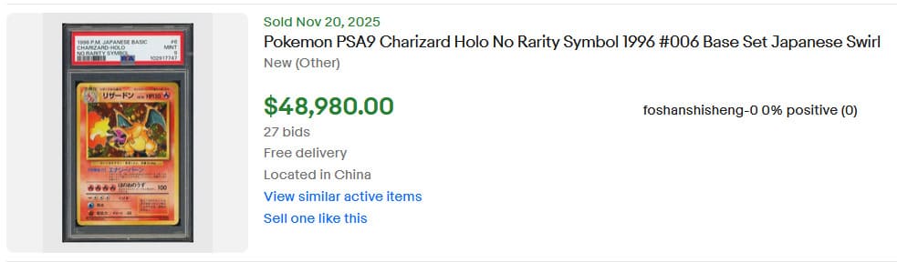 Trophäenkarten werden ausschließlich an die Erst-, Zweit- und Drittplatzierten der jährlichen Pokémon-Weltmeisterschaften vergeben. Diese extrem seltenen Sammlerstücke gelangen nur dann auf den Markt, wenn sich ein Gewinner entscheidet, sein Exemplar zu veräußern. Die hier vorgestellte Vollbild-Promokarte stammt aus dem Jahr 2015. Das CGC-8-Exemplar wurde am 23. November 2025 bei eBay im Rahmen eines Preisvorschlags verkauft. Auch wenn der genaue Verkaufspreis unbekannt ist, liegt er mit hoher Wahrscheinlichkeit im fünfstelligen Bereich.