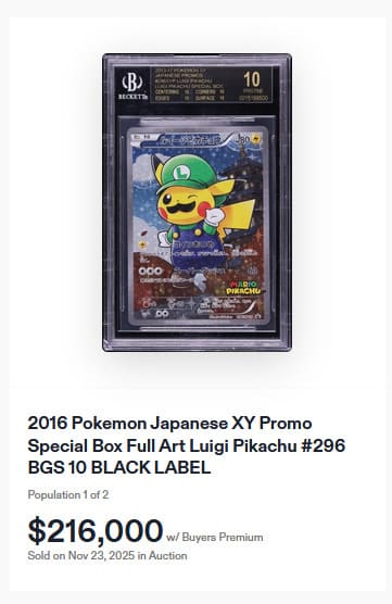Rekordpreis für Luigi-Pikachu! Diese exklusive japanische Promokarte war ausschließlich in einer Spezialbox enthalten, die im Jahr 2016 in offiziellen Pokémon-Center-Geschäften erhältlich war. Eines von nur zwei einwandfreien BGS-10-Exemplaren mit Black Label wurde vor wenigen Tagen beim renommierten US-amerikanischen Auktionshaus Fanatics Collect für unglaubliche 216.000 US-Dollar (ca. 187.500 €) versteigert.