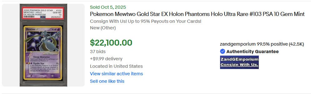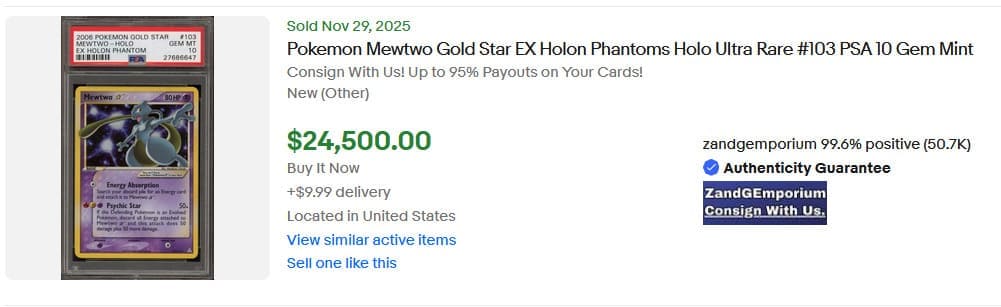 Das englische Mewtwo-Goldstar aus der Erweiterung EX Holon Phantoms konnte seinen Wert im Vergleich zum vergangenen Monat um mehr als 2.000 US-Dollar steigern und erzielte einen Verkaufspreis von 24.500 US-Dollar (ca. 21.100 €). Im vergangenen Jahr waren PSA-10-Karten noch für unter 10.000 US-Dollar erhältlich.
