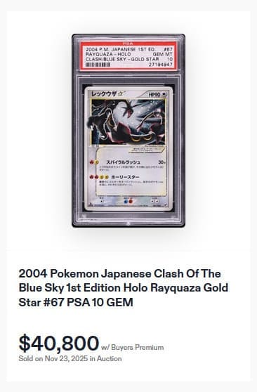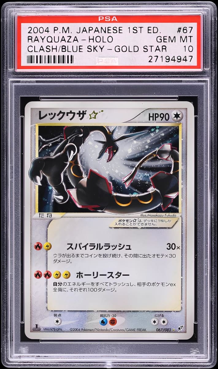 Ein Sammler sicherte sich die geprägte Full-Art-Karte von M-Rayquaza-EX aus der beliebten Erweiterung Drachenleuchten mit PSA-10-Bewertung für 11.900 US-Dollar (ca. 10.250 €). Dieser Preis liegt deutlich unter den 15.000 US-Dollar, die ein weiteres PSA-10-Exemplar im vergangenen Monat erzielte.