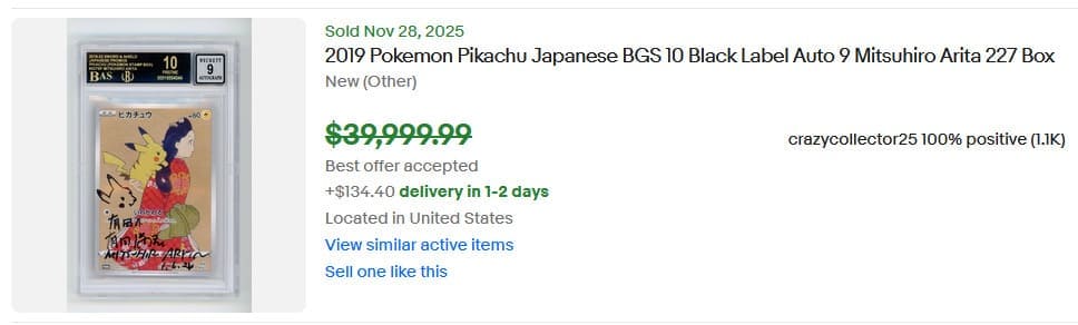 Dieses besondere Exemplar wurde nicht nur von Beckett als makellos bewertet, sondern auch vom berühmten Illustrator Mitsuhiro Arita persönlich signiert. Ursprünglich für 40.000 US-Dollar angeboten, wechselte die Karte am 28. November nach einem Preisvorschlag den Besitzer. Wir gehen von einem Verkaufspreis von über 10.000 US-Dollar aus.