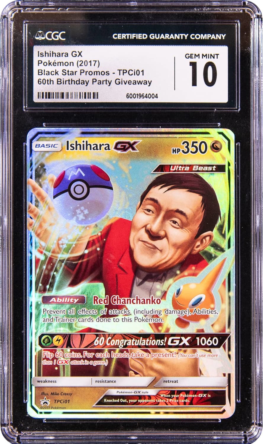 Diese besonders seltene Pokémon-Karte wurde im Jahr 2017 in einer äußerst begrenzten Auflage zum 60. Geburtstag von Tsunekazu Ishihara, dem Präsidenten der Pokémon Company, an enge Freunde sowie einige wenige Mitarbeiter verteilt. Ishihira-GX war niemals offiziell im Handel erhältlich, und bis heute kennt niemand die genaue Stückzahl – was die Karte zu einem wahren Schatz für Sammler macht.