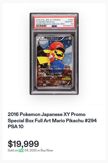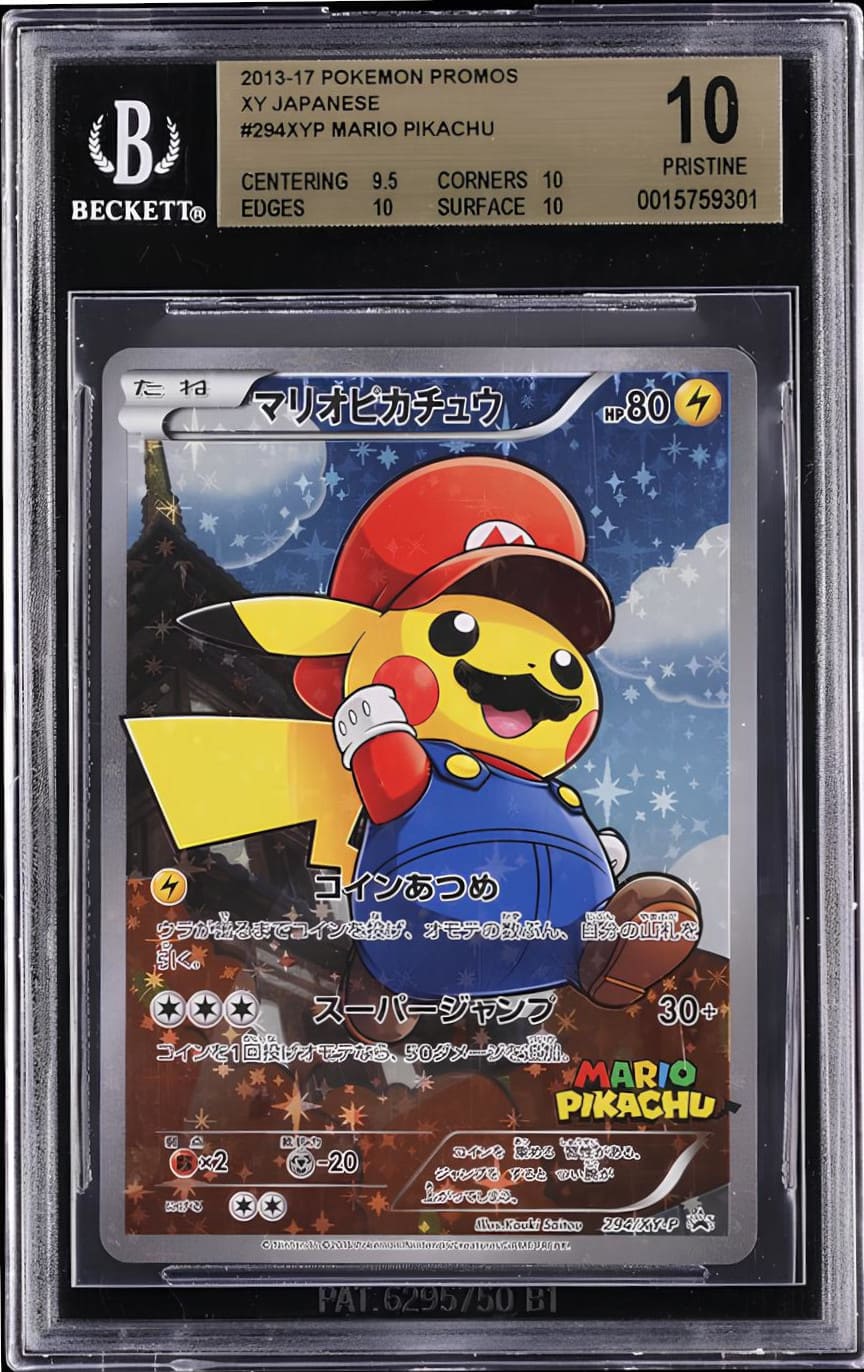 It’s-a me, Pikachu! Die farbenfrohe japanische Promokarte von Mario-Pikachu hat ihren Marktwert im Vergleich zu 2024 mehr als verdoppelt. In den vergangenen Tagen wurden gleich zwei bewertete Exemplare für Höchstpreise von jeweils 20.000 US-Dollar (ca. 17.100 €) versteigert.