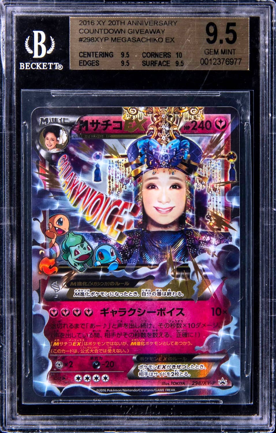 Diese holografische Promokarte von M-Sachiko-EX ist eine Besonderheit, da es sich um eine der wenigen Pokémon-Karten handelt, die einen echten Menschen abbildet. Sie wurde an die Teilnehmer des 20th Anniversary Countdown verteilt, einem besonderen Event, das am 19. Oktober 2016 in Tokio anlässlich des 20. Jubiläums des Pokémon-Sammelkartenspiels veranstaltet wurde. Das Event war auf 100 Teilnehmer beschränkt, die über ein Lotteriesystem ausgewählt wurden. Auf der Illustration ist die japanische Sängerin Sachiko Kobayashi gemeinsam mit Glumanda, Schiggy und Bisasam zu sehen. Ein BGS-9.5-Exemplar ging am 19. Oktober 2025 für 17.000 US-Dollar (ca. 14.600 €) über den Ladentisch.