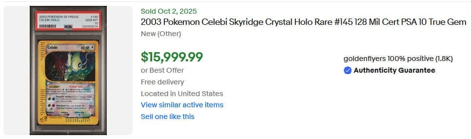 Bereits im September erzielten zwei begehrte Kristall-Pokémon-Karten von Glurak und Lugia neue Spitzenpreise von über 40.000 US-Dollar. Auch wenn diese Werte im Oktober bislang nicht übertroffen wurden, investierten Sammler dennoch jeweils mehr als 10.000 US-Dollar in eine englische Karte von Kristall-Celebi sowie in eine japanische Karte von Kristall-Lugia.