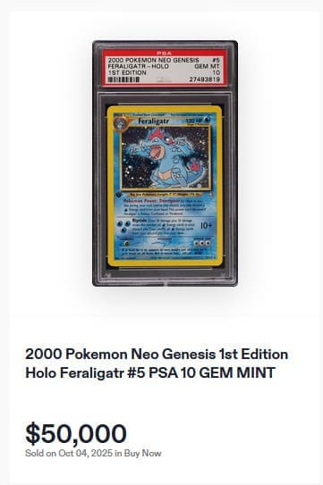 Neben beliebten Ikonen wie Lugia enthält Neo Genesis auch eine holografische Karte des voll entwickelten Johto-Starter-Pokémon Impergator. Ein makelloses englisches 1st-Edition-Exemplar wurde vor wenigen Tagen für beeindruckende 50.000 US-Dollar (ca. 42.500 €) versteigert. Bis zum Zeitpunkt dieses Artikels wurden insgesamt nur 22 Karten mit der höchstmöglichen PSA-10-Bewertung ausgezeichnet.