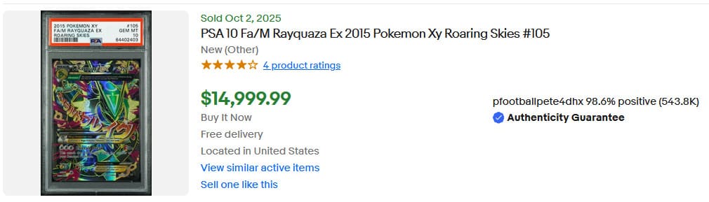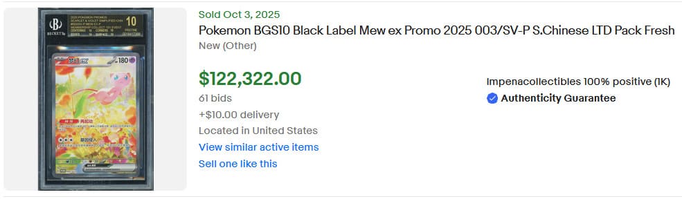 Die exklusive chinesische Mew-ex-Promokarte sorgte im August 2025 für Aufsehen, als ein makelloses Black-Label-Exemplar für beeindruckende 125.000 US-Dollar versteigert wurde. Der ursprüngliche Käufer entschied sich nun, dieselbe Karte erneut zu verkaufen. Sie erzielte bei einer eBay-Auktion 122.300 US-Dollar (ca. 104.000 €), was einen Verlust von etwa 3.000 US-Dollar bedeutet.