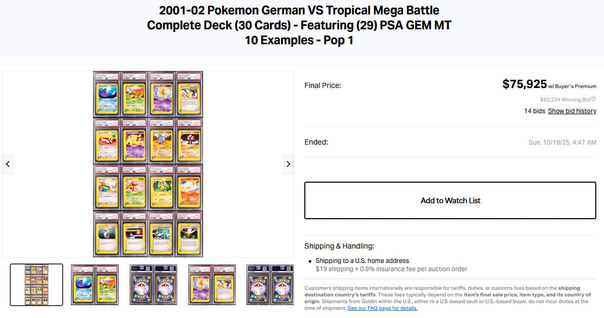 Am 19. Oktober 2025 wurde ein vollständiges deutsches Halbdeck für eindrucksvolle 75.900 US-Dollar (ca. 65.200 €) versteigert. Bis auf ein Exemplar wurden alle Karten mit der höchstmöglichen Bewertung „PSA 10“ ausgezeichnet.