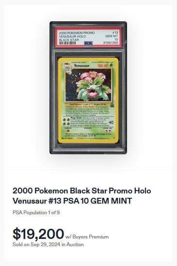Die allerersten Black Star Promokarten wurden bereits im Jahr 1999 veröffentlicht, um die Begeisterung für das ikonische Basis-Set des Pokémon-Sammelkartenspiels weiter zu entfachen. Diese spezielle Bisaflor-Karte war ausschließlich als Beilage im Player´s Guide für das „Pokémon Trading Card Game“-Videospiel erhältlich. Ein PSA-10-Exemplar wurde kürzlich für 19.200 US-Dollar (ca. 16.300 €) versteigert.