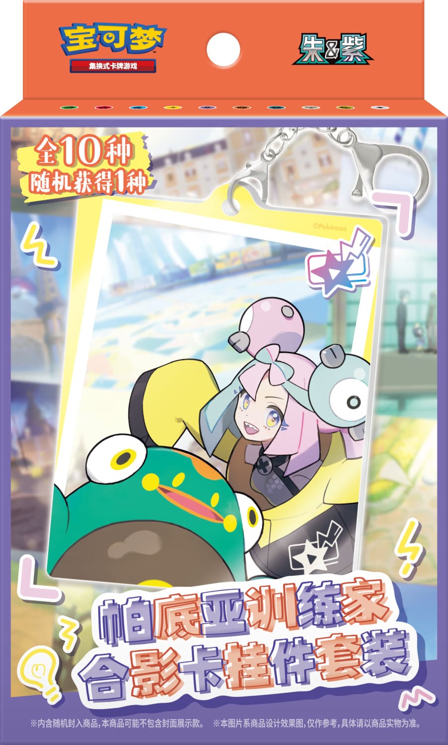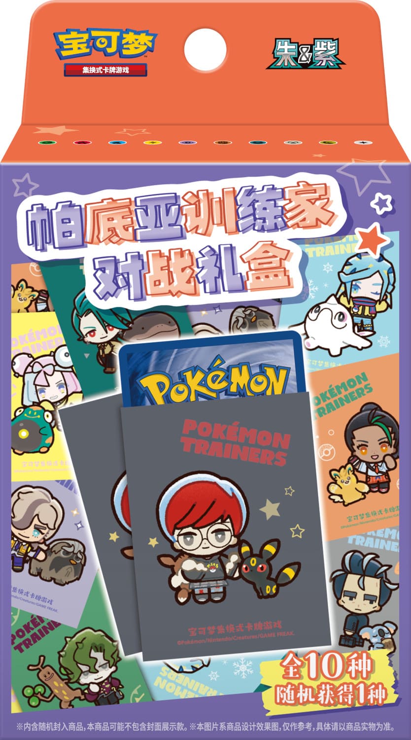 Jede Box enthält einen zufällig ausgewählten Kartenanhänger, der einen Trainer aus der Paldea-Region gemeinsam mit seinem Partner-Pokémon zeigt, sowie eine dazu passende holografische Promokarte. Zur Auswahl stehen Pepper, Nemila, Cosima, Grusha, Enigmara, Cay, Colzo und Aoki.
