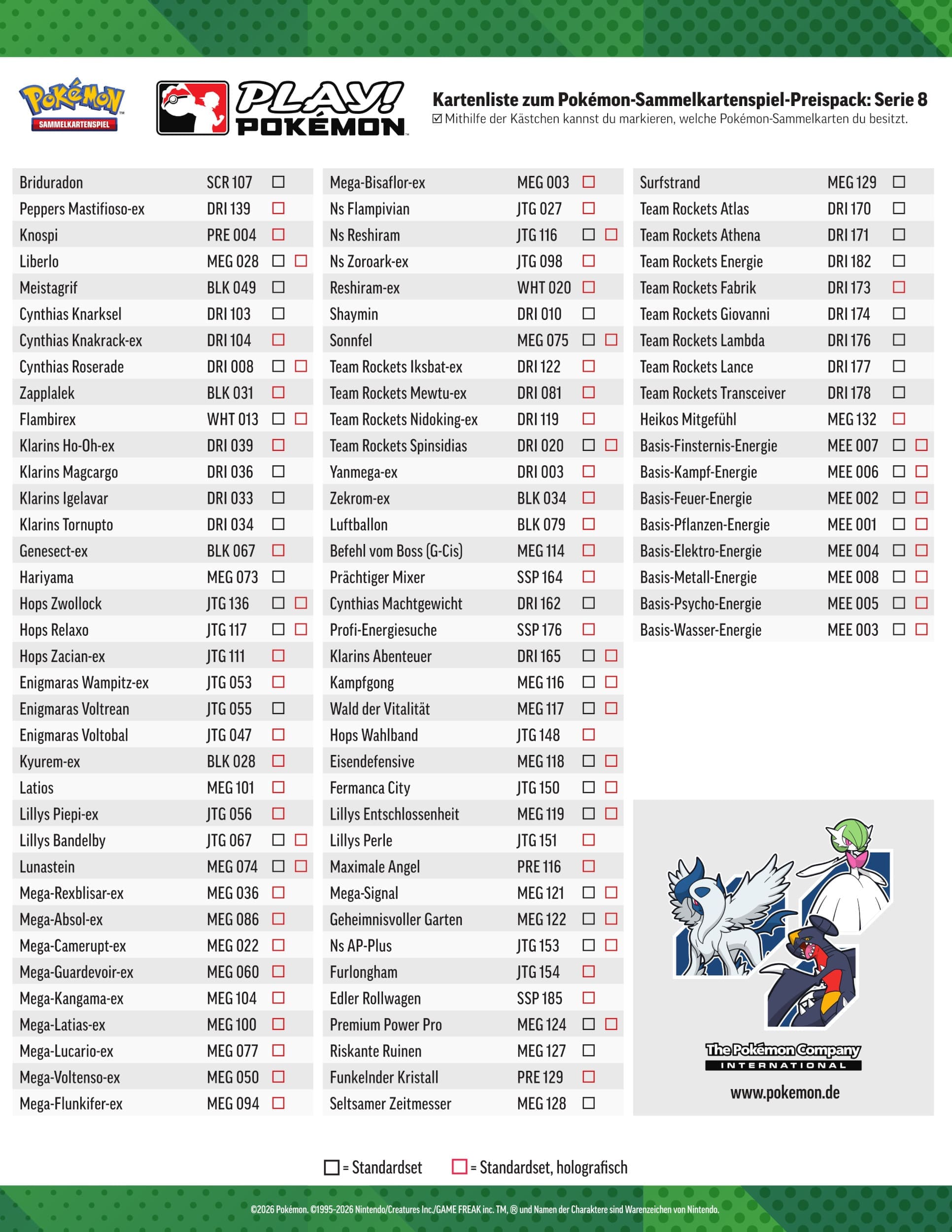Hier kannst du die Kartenliste der Preispack-Serie 8 als JPG-Bild oder PDF herunterladen. Der PDF-Download erfolgt direkt von der offiziellen Pokémon-Webseite.