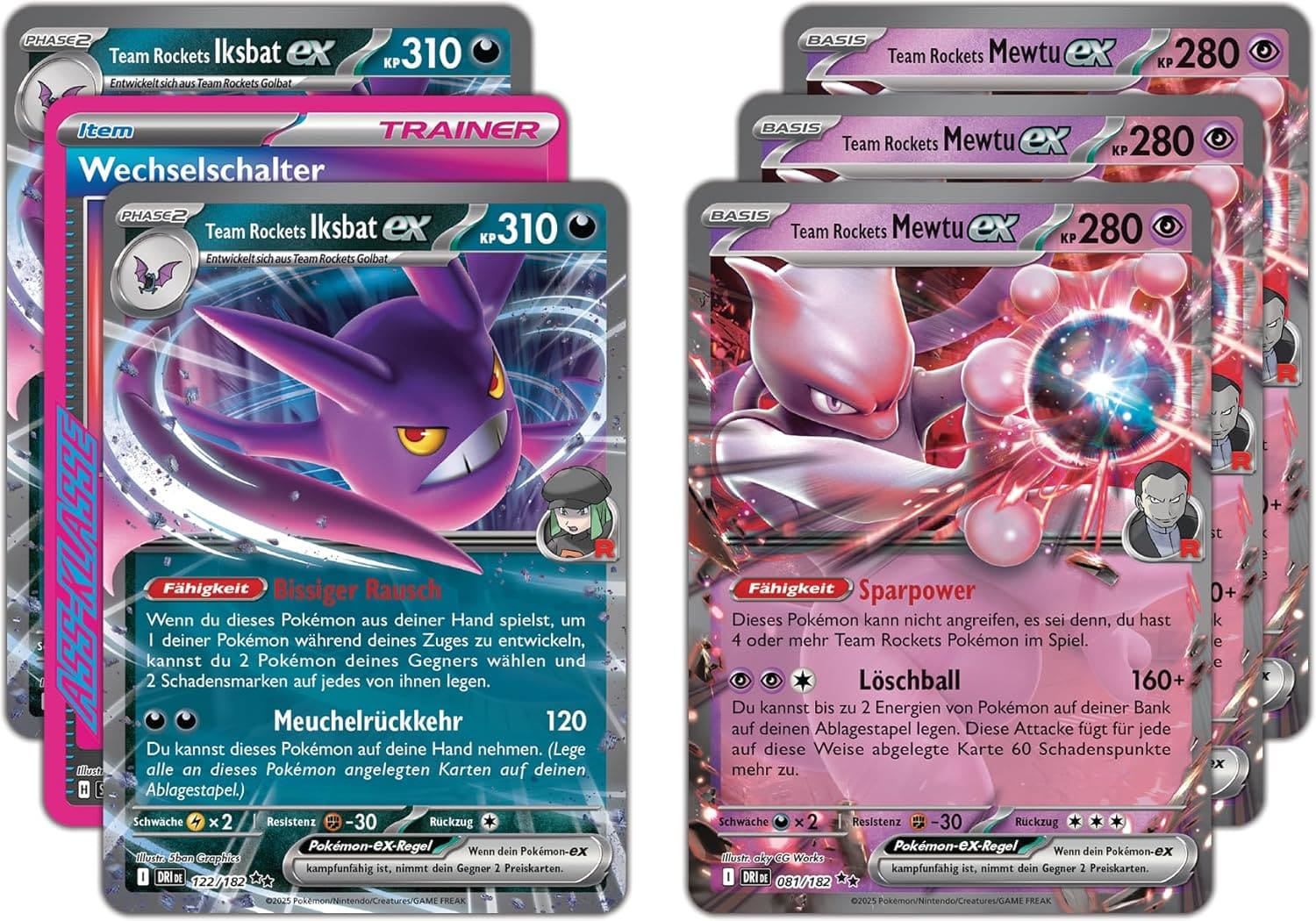 Team Rockets Mewtu-ex gehört zu den absoluten Kraftpaketen der beliebten Erweiterung Karmesin & Purpur – Ewige Rivalen. Seine Attacke „Löschball“ richtet mit drei Energien bereits 160 Schadenspunkte an – und kann auf beeindruckende 280 Punkte hochschießen, wenn du zwei Energien von deinen Bank-Pokémon ablegst. Doch Vorsicht: Durch seine Fähigkeit „Sparpower“ darf Mewtu erst zuschlagen, wenn du mindestens vier Team Rockets Pokémon im Spiel hast.